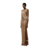 Abito da sera in jersey di viscosa lucida dalla vestibilità slim. Il vestito è smanicato con drappeggio su un fianco, accentuato dallo spacco laterale sulla gonna. Focus sulle spalle, strutturate e chiuse dalla mezzaluna in metallo dorato per una luce inedita. Sul retro, scollo a V con nastro.